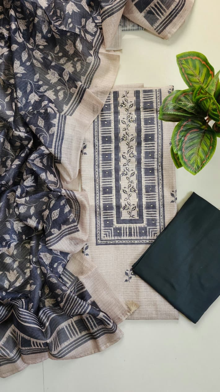 Top (2.50 meters) Beige linen chanderi neck and daman handcrafted -